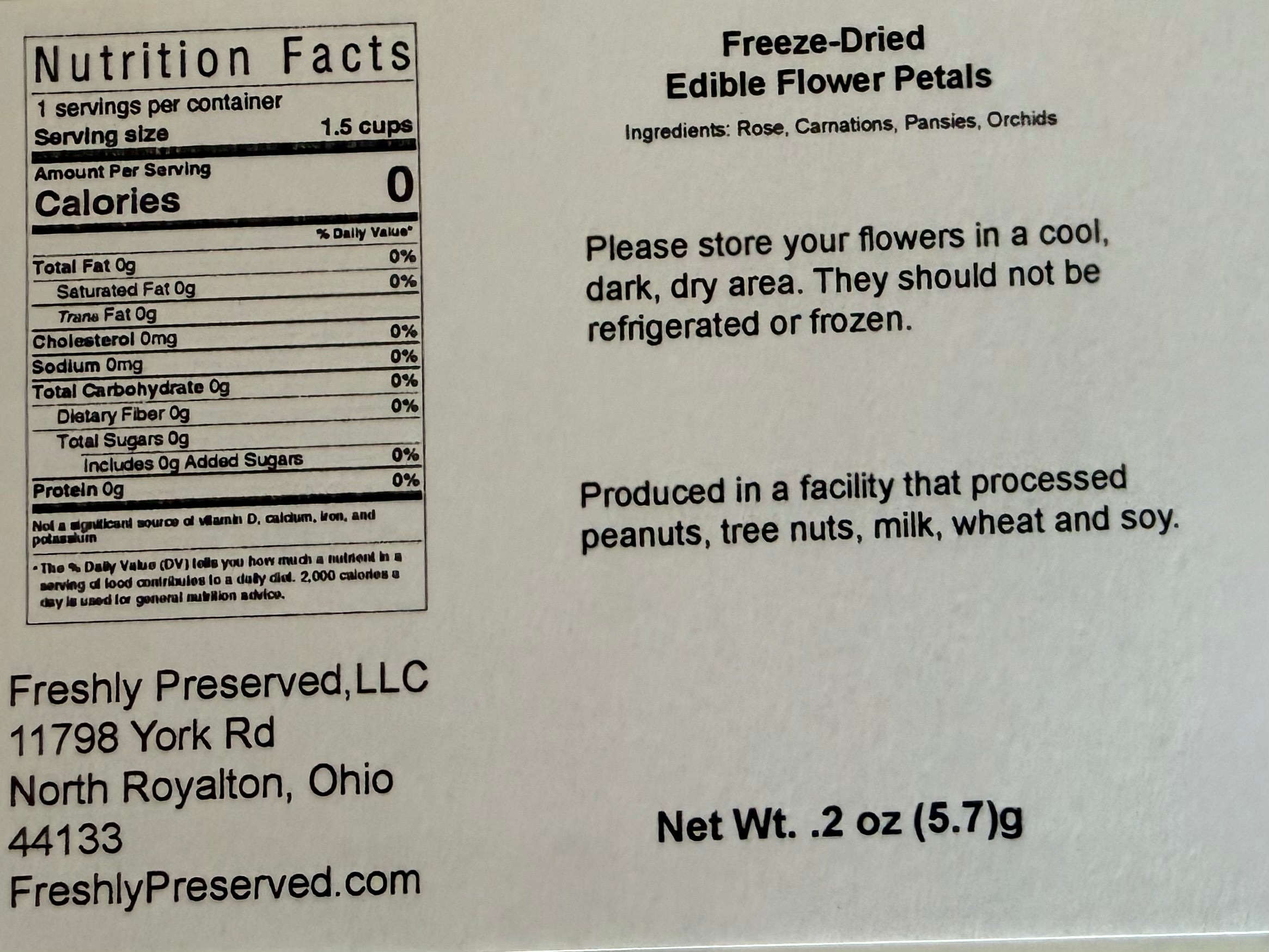 Cultivated and Freeze-Dried in the USA: We select only food-grade edible flowers grown in the United States from farmers known for their high standards. We are a licensed, woman-owned commercial freeze-drying shop located in N. Royalton, Ohio. Our freeze-drying process preserves the vibrant colors, flavors, and nutrients of edible flowers, offering a shelf life of up to 1 year without added sugar, salt, or preservatives.
